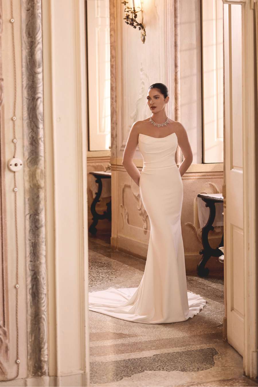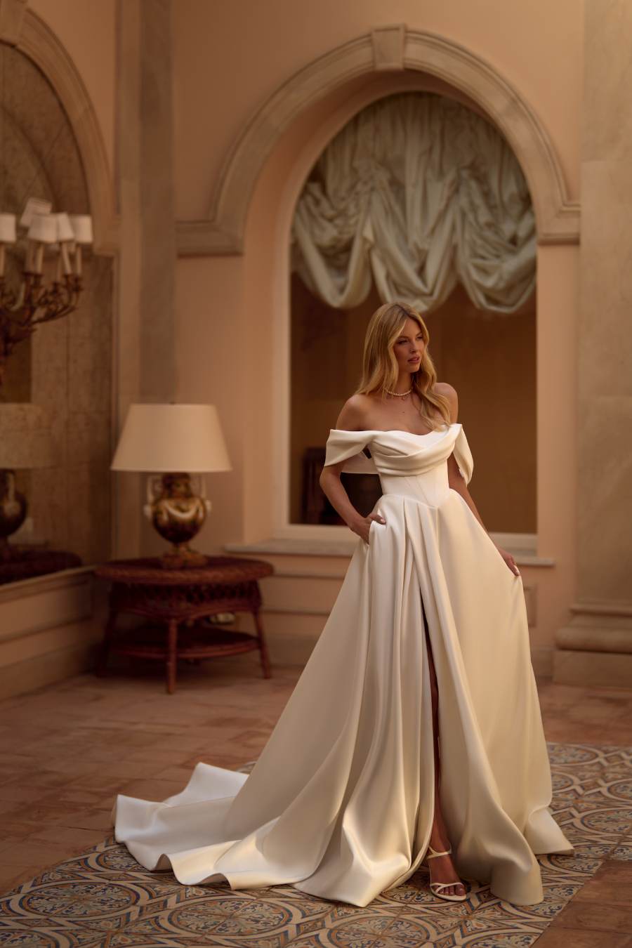 • Clean Brautkleid aus Satin mit Corsage, Off-Shoulder-Trägern und edlem Faltenrock – eleganter Look von Novia Feliz in luxuriösem Ambiente